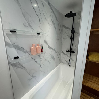 This led to installing the bathtub and new marble-effect wall paneling to enhance the feel of an open showering space.