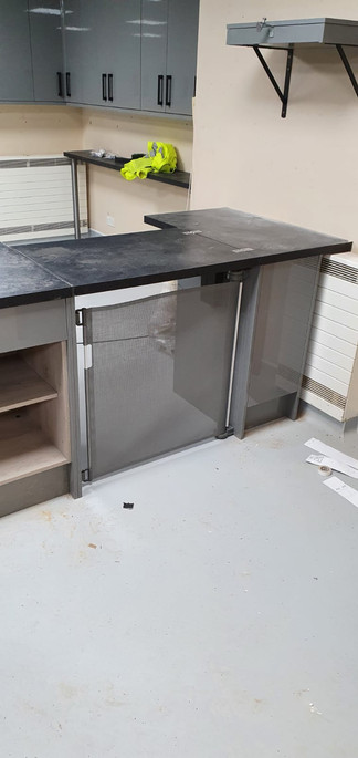 Working closely with the client through detailed design consultations, we developed a bespoke layout featuring an adjustable-height worktop with integrated electric hobs. A unique challenge during the design phase was ensuring the splashback maintained a watertight seal even when the worktop was in a lowered position—preventing liquid ingress while maintaining full adjustability.