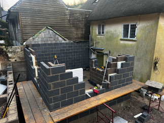 Working closely with our trusted structural engineer, we poured underpinning footings for the adjacent property and reinforced footings for both the extension and retaining wall. Once the masonry reached DPC level, a concrete slab was laid to form a strong, level base for the interior floors. As the structure took shape, our skilled carpenters installed a custom-cut roof around a central steel ridge beam, showcasing the craftsmanship at the heart of every Dorset Build project.